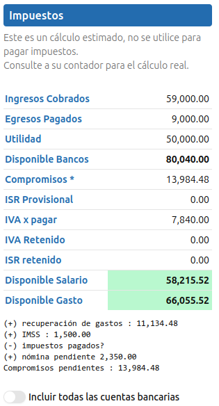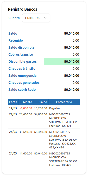 Permite ver los movimientos bancarios, esto solo es funcional si usa el modo avanzado registrando correctamente toda su cobranza, pagos a proveedores y registros de transferencias.