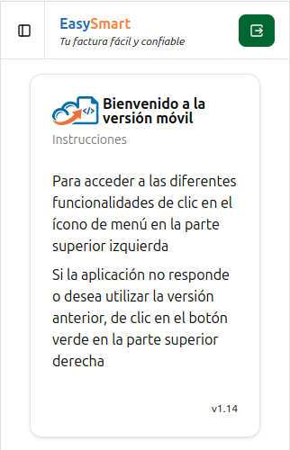 El ícono superior derecho (botón verde) le permitirá navegar a la versión vieja del sistema móvil. Esto pudiera ser necesario si la aplicación no funciona correctamente en su teléfono (en teléfonos con navegadores muy viejos o no actualizados) o si encuentra que alguna funcionalidad de la nueva versión no está operando normalmente.