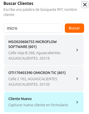 En el modo avanzado las responsabilidades están distribuidas entre usuarios y en el caso de vendedores, solo puede seleccionar clientes existentes o dar de alta un nuevo RFC, la responsabilidad e llenar los datos fiscales y modificarlos en su caso recae en las personas que operen en oficina para tener estos datos correctos y al día. Por este motivo el vendedor solo podrá seleccionar clientes pero no modificar datos fiscales.