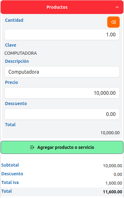Cuando presione el botón de Productos, se expande el formulario con los productos previamente seleccionados y el botón para localizar y seleccionar un nuevo producto o servicio a facturar.